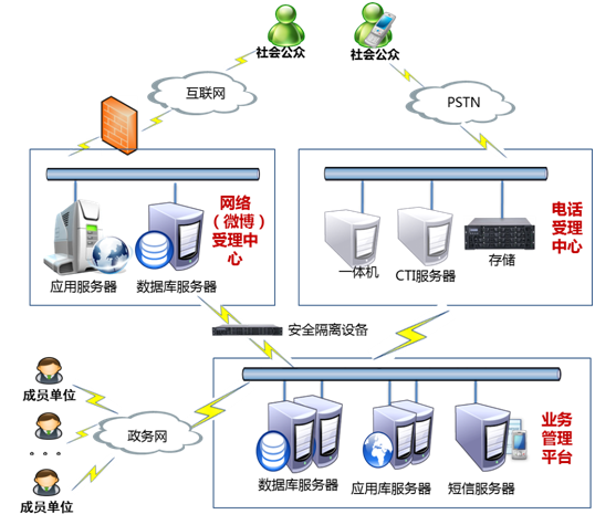 部署采用集中部署,建立統(tǒng)一的呼叫中心,負責所有電話的受理,對于呼叫中心無法處理的問題,形成電子工單,分派到各下級單位處理。網絡受理中心系統(tǒng)和微博受理中心系統(tǒng)共用應用服務器和數據庫服務器,考慮問題,網絡(微博)受理中心與業(yè)務管理平臺服務器之間將通過隔離設備進行隔離。